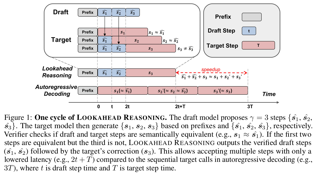 위 그림은 reasoning 모델에 대한 인사이트를 이용하여 CoT의 추론 단계를 draft로 추측하는 reasoning 모델 전용 speculative decoding인 lookahead reasoning 방식을 나타내는 그림이다. 동작 순서는 다음과 같다.