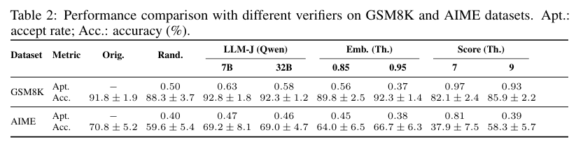 이 중 LLM-as-a-Judge의 경우, 정확도가 기존에 비해서 미미하게 하락했지만 거의 영향이 없는 수준이였다. 만면 랜덤 accept과 scoring 방식의 경우 전체적으로 성능이 하락했다. embedding 방식의 경우, accept 되는 유사도 기준을 0.95까지 올린 경우, 정확도 유지가 이루어졌다. 하지만 이 경우, acceptance rate가 감소하기 때문에 이는 trade-off로 작동한다.