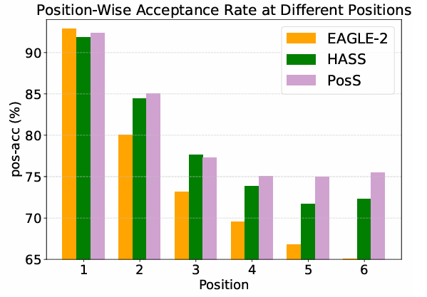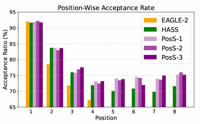 앞서 언급하였듯, 이전의 EAGLE-2와 HASS는 하나의 draft layer가 여러 위치의 토큰을 잘 생성 할 수 있다는 일반화 능력에 의존한다. POSS는 이에 대한 일반화의 한계를 보여주기 위해 position-wise acceptance rate을 다음과 같이 정의하였다. 이는 이전 위치의 토큰이 accept 되었다는 조건 하에, 해당 위치의 토큰이 accept 될 확률을 의미한다.