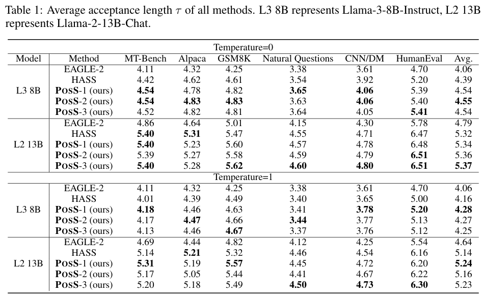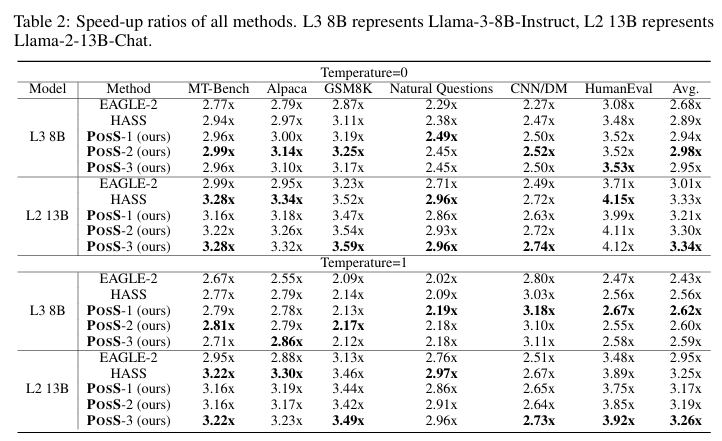 POSS의 실험을 위해서 EAGLE-2와 동일하게 6개의 데이터셋으로 speed-up ratio와 평균 acceptance length를 측정하였다. 모델은 LLaMA-3 8B instruct 모델과 LLaMA-2 13B chat 모델을 사용하였다. 추론 시에는 Sequoia 논문에서 사용 된 tree drafting을 사용하였으며, LLaMA-3에서는 tree depth를 6, 2에서는 7을 사용하였다.