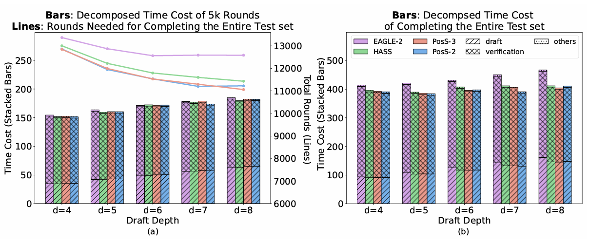 위 그래프는 POSS의 computational overhead에 관련 된 그래프이다. 왼쪽은 5000 라운드 동안 draft depth별 계산 시간을 표시한 결과로, EAGLE-2에 비해 낮고 HASS에 비해 약간의 오버헤드만 보였다. 또한 왼쪽 그래프의 선은 draft 전체 생성에 필요한 총 라운드 수를 의미한다. POSS가 다른 비교군에 비해 라운드 수 또한 적음을 알 수 있다. 오른쪽 그래프는 전체 decoding에 소모 되는 시간을 나타낸 것으로, POSS가 비교군들에 비해 낮은 latency를 갖는데, 이는 라운드 수 감소로 얻는 효율 향상이 POSS의 오버헤드를 충분히 상쇄하고도 남는다는 것을 보여준다.