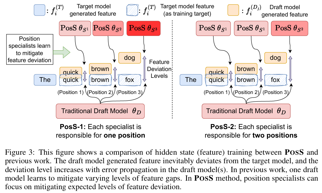 위 그림은 POSS가 단일 draft 모델보다 왜 더 효과적인지를 설명해준다. trainig이 잘 되어 있더라도, draft 모델이 생성한 hidden state는 target 모델의 feature와 점점 더 차이가 발생하게 된다. 이러한 feature의 편차는 draft가 진행 될수록 누적 된 오차로, 위 그래프에서 보라색 화살표를 의미한다. POSS는 각 위치에서 specialist가 예측 가능한 범주의 feature 편차를 다룰 수 있기 때문에 각 위치에 특화 된 subtask 형태로 분할이 되고, 이를 통해 정확한 draft 예측이 가능해진다.