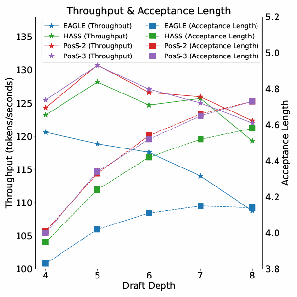 마지막으로 서로 다른 draft depth에서 throughput과 평균 acceptance length를 비교한 그래프이다. draft depth가 커질수록 평균 acceptance length는 증가하지만, 개선 폭은 점점 줄어든다. 그렇기 때문에 throughput의 최적 지점이 존재하는데, POSS의 경우 8번째 위치에서 최적의 speed-up을 달성했다.