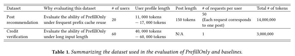 우선 이 논문에서 사용한 데이터셋은 2가지이다. 소셜 미디어 플랫폼에서 추출한 게시물 추천 관련 데이터셋과 은행 애플리케이션의 신용 검증 데이터셋으로, 각각 평균적으로 소셜 미디어 플랫폼은 14,000 토큰, 그리고 은행 애플리케이션의 신용 검증은 40,000에서 60,000 토큰 정도의 요청 길이를 가지고 있다고 한다.
