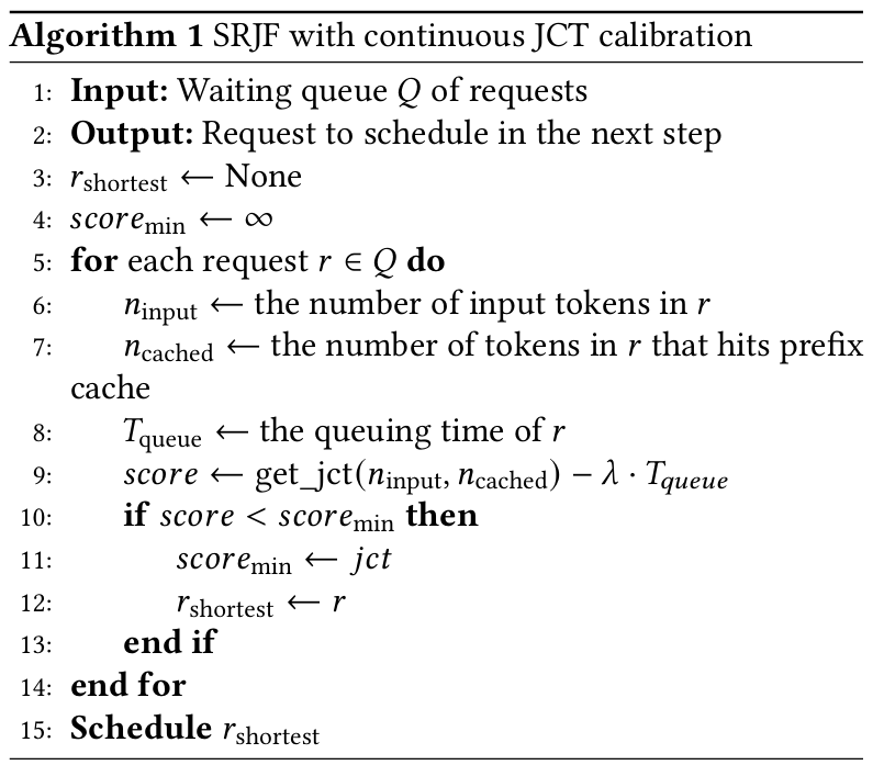 위 알고리즘에 9번 라인에서 값을 JCT에서 빼주는 구간이 있는데, 이는 SRJF가 가지는 starvation 문제를 해결하기 위해 어드밴티지를 주는 과정이다. 는 요청에 대한 큐에서 대기한 시간을 의미한다. 즉, 큐에서 오래 기다린 요청일수록 더 많은 어드밴티지를 얻게 되어 다음 요청으로 선정 될 가능성이 커진다. 값은 특정한 하이퍼파라미터 값으로, 이를 너무 높이게 되면 요청에 대한 지연 시간이 개선되지만 평균 지연 시간은 악화될 수 있다.