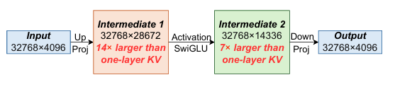 Llama 3.1 8B 모델이 32,768 토큰을 Prefill 할 때, 발생하는 tensor shape의 순서를 보면 KV cache에 비해 14배 크게 측정이 되었다. 이는 Llama 모델에서만 발생하는 경향은 아니며, 이러한 이유는 기존 LLM 모델들이 decoding 처리량을 높이기 위해 batch size를 키우고, 더 긴 LLM 요청을 처리하기 위해 KV cache의 크기를 줄이도록 설계되었기 때문이다.