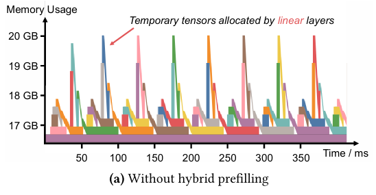 결국 중간 단계에서 발생하는 tensor 크기를 줄이기 위해 고안 된 방식이 Hybrid Prfilling이다. 방법은 간단한데, Attention 레이어는 그대로 prefill을 하고, 그 외 레이어는 chunk 단위로 쪼개서 prefill 하는 방식이다. Attention의 경우, 입력 문장을 chunk로 분리하게 되면 positional encoding이 깨지거나 cross-attention을 새로 고려해야 하는 반면, 그 외 다른 레이어는 linear layer라서 chunk 단위로 분리하더라도 독립적인 계산이 가능하다. 즉, 결과에 이상이 생기지 않는다.