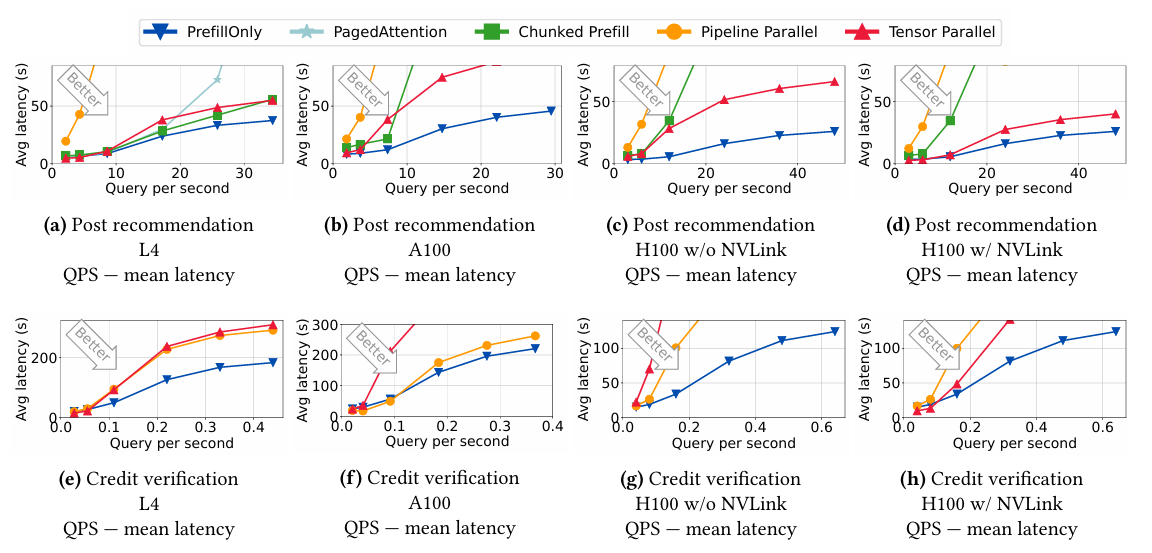 위 그래프는 초당 쿼리 수 (QPS) 증가에 따른 평균 latency에 대한 비교를 보여준다. 초당 들어오는 쿼리가 점점 많아지는 경우, PrefillOnly가 다른 LLM engine에 비해 좋은 처리 속도를 보여준다. 다만 요청량이 많지 않은 경우, Parallelism을 적용 했을때에 비해 성능이 좋지 않은데, 이는 PrefillOnly의 경우 단일 GPU에서 요청을 처리하는 반면, Parallelism 기법을 적용한 LLM engine은 2개 이상의 GPU를 사용했기 때문이라고 한다.