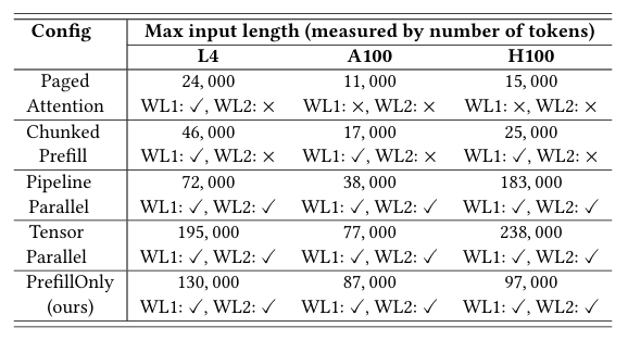 비교를 위한 GPU와 baseline은 위와 같다. Paged Attention 방식은 vLLM을 그대로 사용한 것으로 보이고, Chunked Prefill은 Sarathi-Serve라는 LLM engine을 사용한 것으로 보인다. PrefillOnly의 값은 500을 사용했다고 한다.