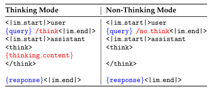 Qwen 3의 가장 큰 특징 중 하나인 thinking/non-thinking 모드는 위 그림과 같이 플래그를 이용하여 구현이 되어 있다. Qwen 3의 기본값은 thinking 모드이다. 따라서 Non-thinking 모드 샘플의 경우, assistant 응답에 비어 있는 thinking 블록을 유지 시키는 방식을 사용한다. 만약 thinking/non-thinking이 복잡하게 얽힌 멀티턴 대화가 들어오는 경우, 마지막에 사용 된 플래그를 따르도록 설계 되어 있다.