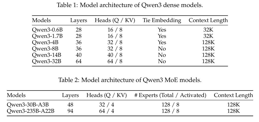 Qwen 3는 6개의 Dense 모델과 2개의 MoE 모델 시리즈로 나누어진다.