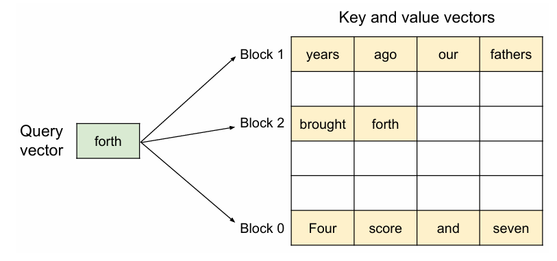 위 그림을 예시로 들면, 쿼리 벡터인 forth 는 KV block 중에서 0번 key 블록인 "Four", "score", "and", "seven" 과 결합하여 0번 Attention block을 만들어 낼 수 있다. 그리고, 0번 Attention block은 0번 value block과 결합하여 결과값을 만들어내게 된다.