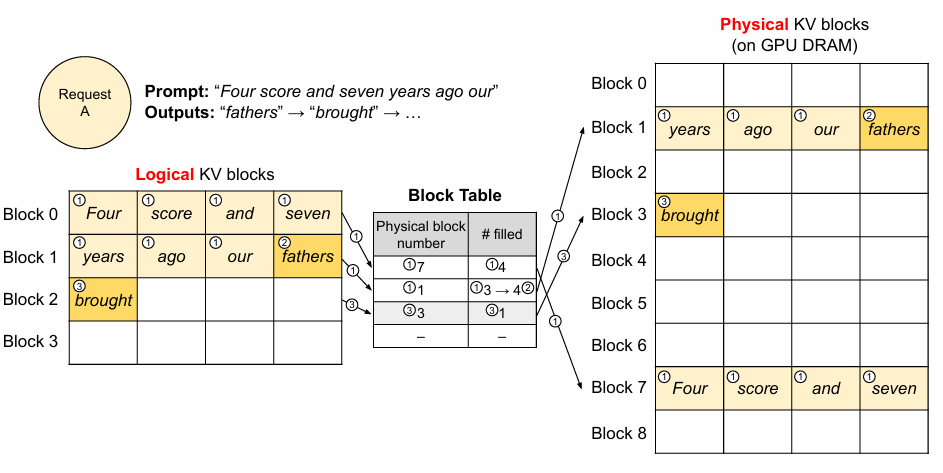 위 예시의 "fathers" 토큰은 블록 공간이 남아있었기 때문에 1번 블록에 할당이 가능했지만, 이 후에 생성 된 "brought"는 새로운 블록이 할당되었다. 그리고 새로 할당 된 블록의 매핑 정보는 block table에 기록이 되었다.