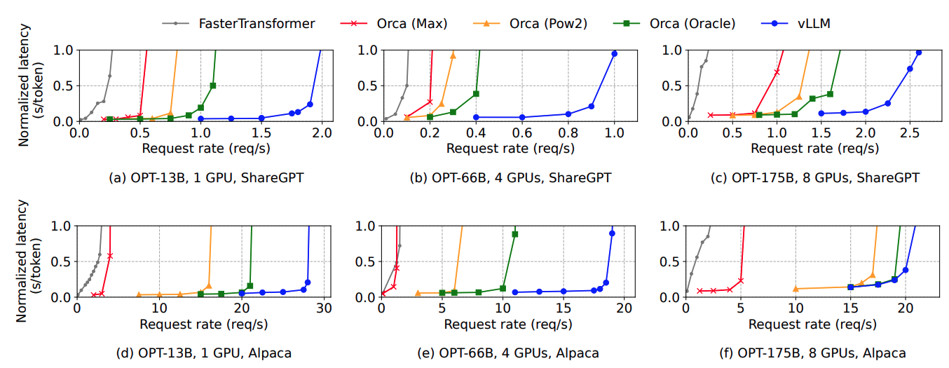 vLLM의 경우, 요청률이 치솟는 구간이 비교군들에 비해 상대적으로 더 큰 값으로 잡혀 있다. 이는 vLLM이 메모리를 효율적으로 관리하기 때문에 더 많은 요청을 batch로 묶어서 처리 할 수 있기 때문이다.
