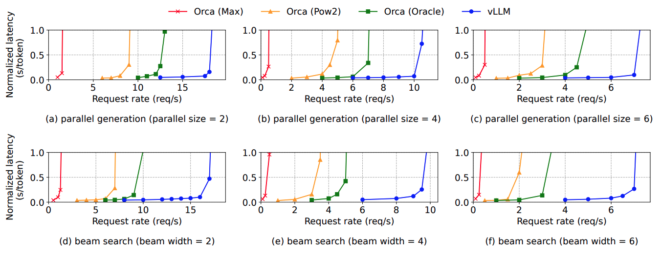 이러한 경향은 다른 sampling 방식을 사용해도 동일하게 나타난다. Parallel sampling이나 beam search의 경우에도 vLLM이 Copy-on-Write 방식으로 효율적인 메모리 관리를 하기 때문에 vLLM이 더 많은 요청을 처리 할 수 있다는 결과를 얻게 된다.