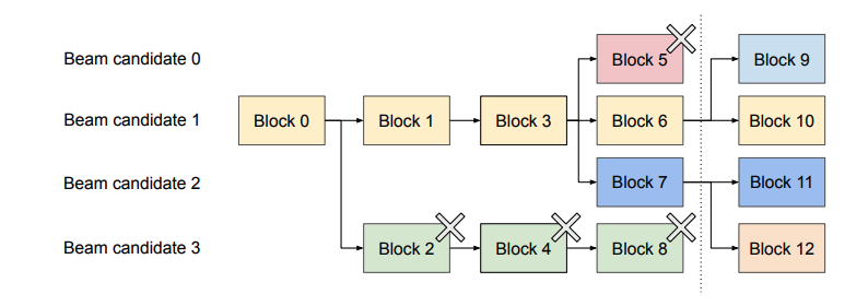 우선 빔 서치의 너비 ()인 상황을 가정한다. 왼쪽에서 오른쪽으로 빔 서치 후보가 생성이 되는데, 모든 후보들은 0번 블록을 공유 하고 있다. iteration이 점점 진행 되면서 유망하지 않다고 결정 되는 토큰이 포함 된 KV block들은 제거가 될 것이고, 점선 이후에 마지막 iteration이 끝나고 나서 생성 된 블록들은 모두 3번 블록까지 공유하게 된다. Parallel sampling과 동일하게 vLLM은 Copy-on-Write를 사용하기 때문에 빔 서치에서 공유 되는 KV Cache도 paged attention에서 동일하게 사용 할 수 있다.