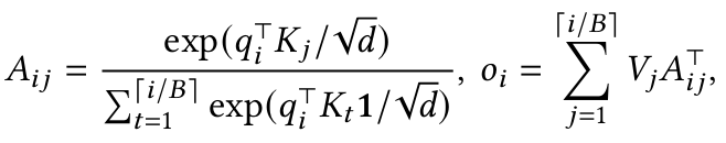 그리고 이전에 Transformer 리뷰에서 사용하였던 Attention 연산 수식에 이 블록들을 대입 할 수 있게 되는데, 그렇게 대입을 해보면 다음과 같이 작성 할 수 있다.