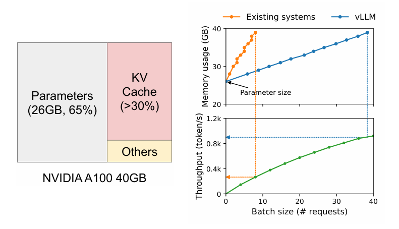 위 그림은 A100에서 13B 크기의 LLM 추론 시 할당 되는 메모리를 어떻게 사용 되고 있는지 그 비율을 나타낸 그림(왼쪽)과, batch size에 따른 thoroughput 및 메모리 사용량을 나타낸 그림(오른쪽)이다.
