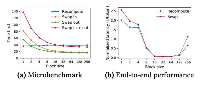 우선 microbenchmark를 보면, recomputation은 블록 크기에 영향을 받지 않는 편이다. 이는 recomputation이 KV Cache 블록을 사용하지 않기 때문이다. 반면에 Swapping은 블록 크기가 작을 때 오버헤드가 크게 나타났다. 블록 크기가 작을 수록 swapping이 자주 일어나야 하고, 그로 인해 CPU와 GPU 사이에서 PCIe 대역폭 활용 문제가 발생하기 때문이다.