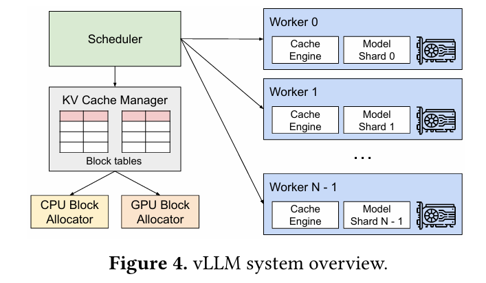 vLLM은 중앙화 된 스케줄러가 하나 있고, 이 스케줄러가 각 GPU worker들의 실행을 관리한다. 그리고 KV Cache Manager는 스케줄러의 명령을 받아서 Paged Attention 방식을 이용하여 물리적인 GPU 블록을 할당하고 관리하게 된다.