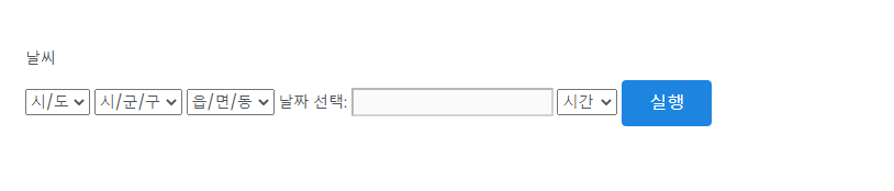 • 실행 버튼 클릭 시 getWeather() 함수가 실행되어 AJAX로 API요청을 한 후 결과값을 해당 페이지에 비동기로 뿌려주게 될 것이다.