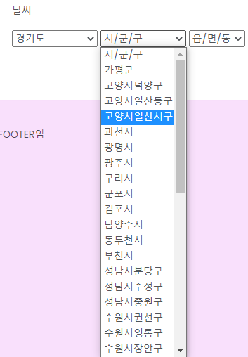 다 작성 하고 다시 페이지로 돌아와서 시도를 선택하면 시군구가 나오고, 시군구를 선택하면 읍면동이 나온다.