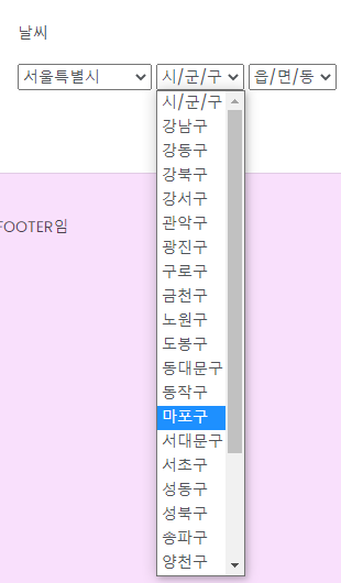 • 시/도, 시/군/구, 읍/면/동 부분은 AJAX를 통해 DB에서 값을 가져와서 동적으로 변경되게 기능을 만들 예정이다.