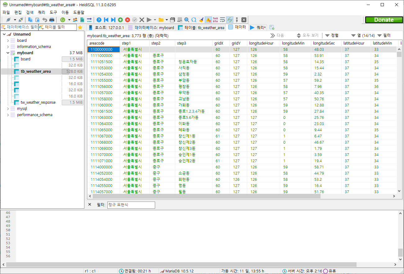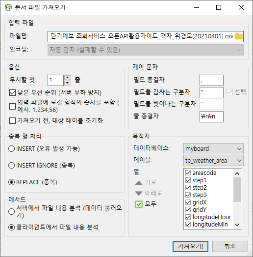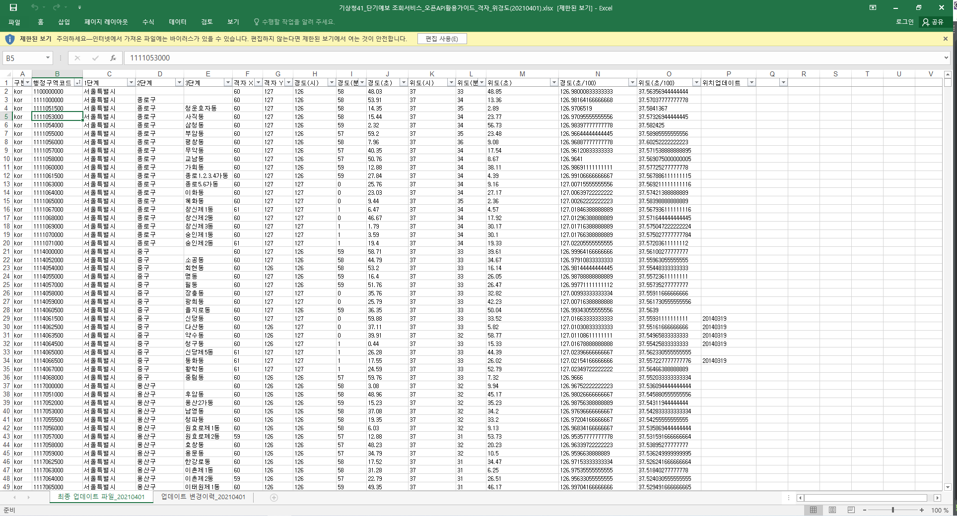 또한 해당 파일에는 API요청시 사용할 수 있는 엑셀 형식의 격자 위 경도(nx, ny)값들이 들어있다.