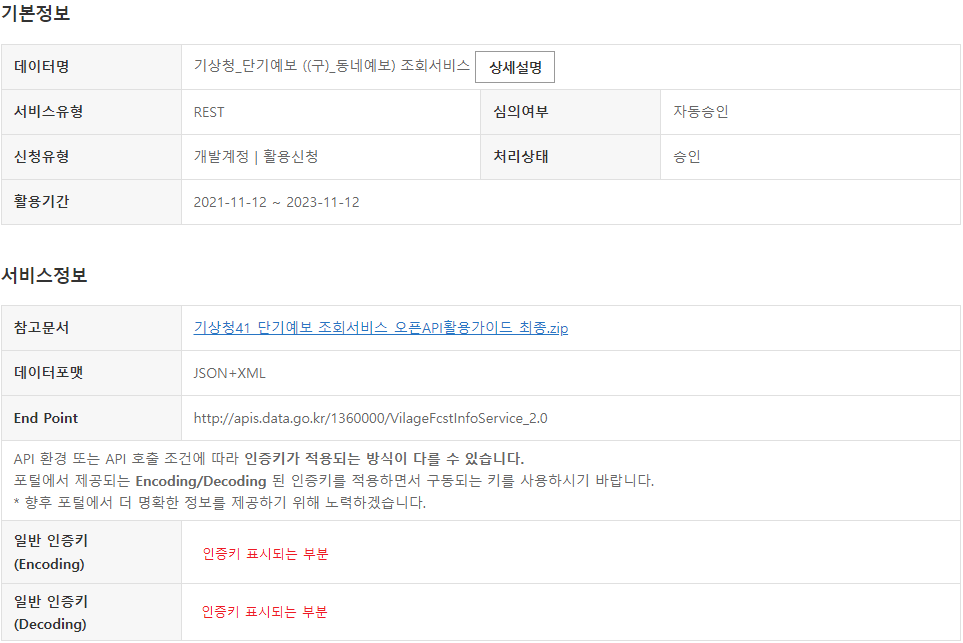 발급 후 마이페이지의 승인된 API 목록을 클릭하면 개발계정 상세보기 페이지의 아래 사진의 Encoding, Decoding Service Key가 발급됨