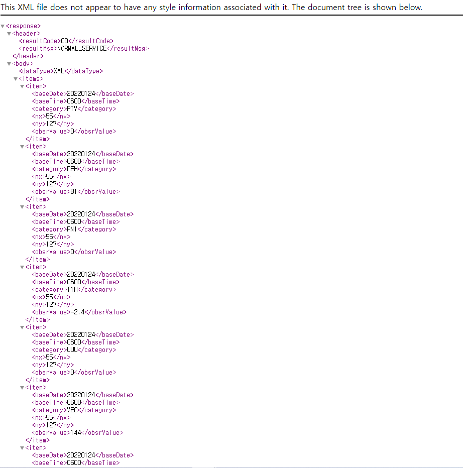 만약 결과값이 안나오면 서비스키를 제대로 입력하였는지, 사용신청 후 1시간 이후가 지났는지 확인하면 된다.