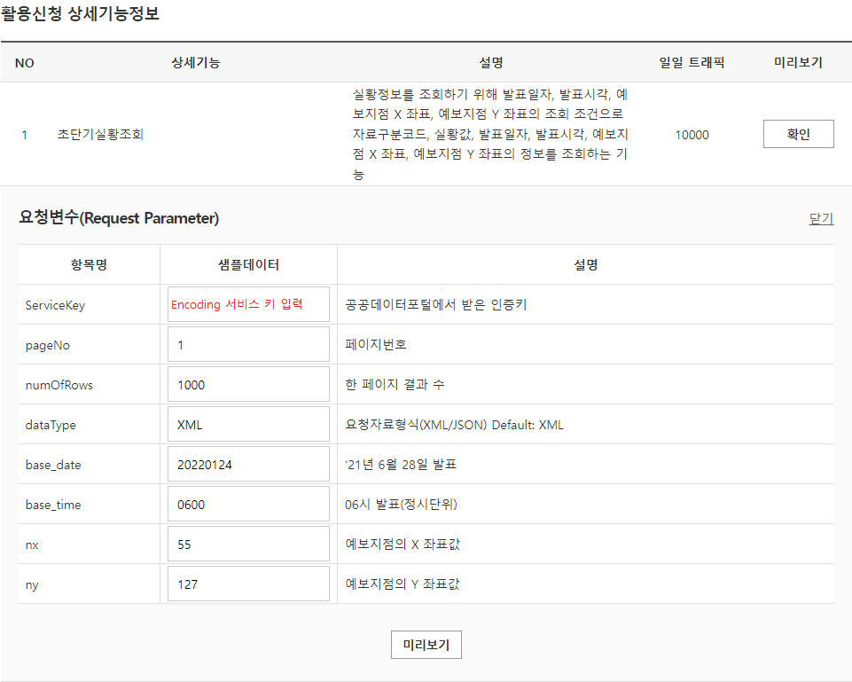 요청 변수에 아까 위에서 발급받은 Service Key(이때 Encoding 키를 넣어야 함)를 항목에 알맞게 복붙 후 base_date를 오늘 날짜로 변경하여 요청한다.(초단기실황은 현재시간으로부터 최대 1일간의 자료만 제공하기 때문에 24시간 이전의 결과값에서 더 이전값은 제공되지 않음)