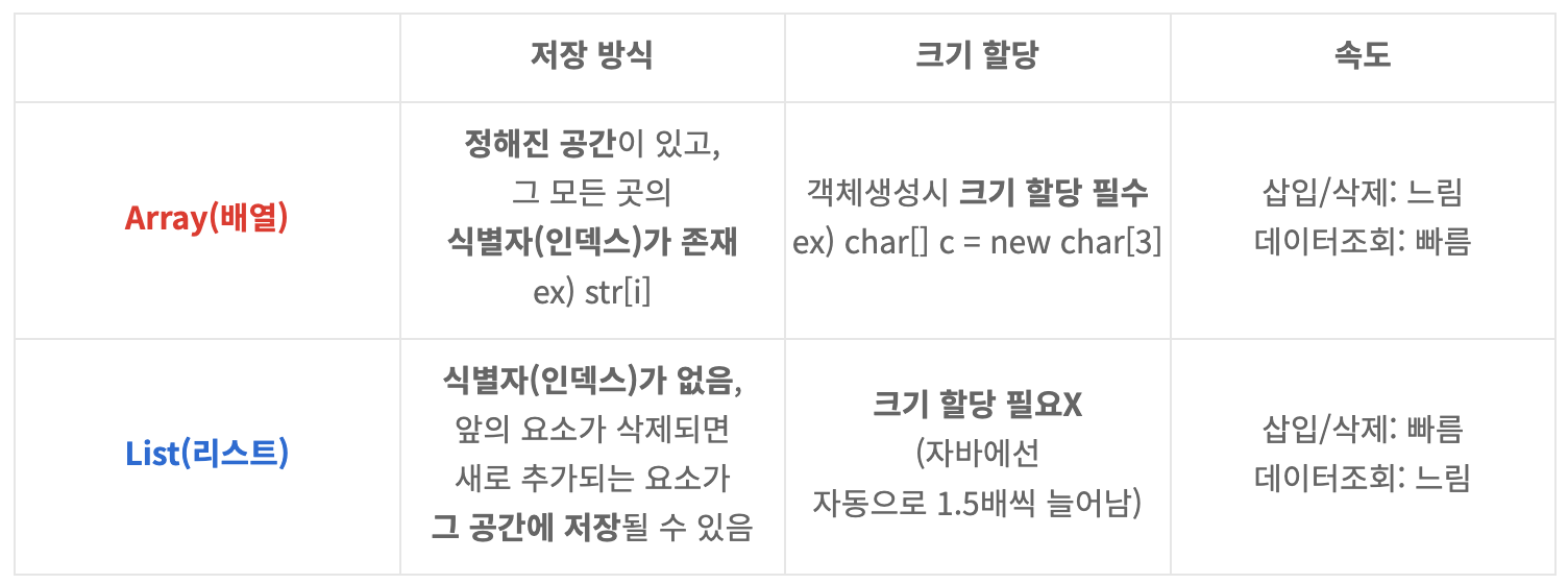 • 자바의 List 종류에는 ArrayList와 LinkedList가 있는데, 그 중 하나인 ArrayList는 Array(배열)와 List(리스트)의 장점을 합친 것이다.