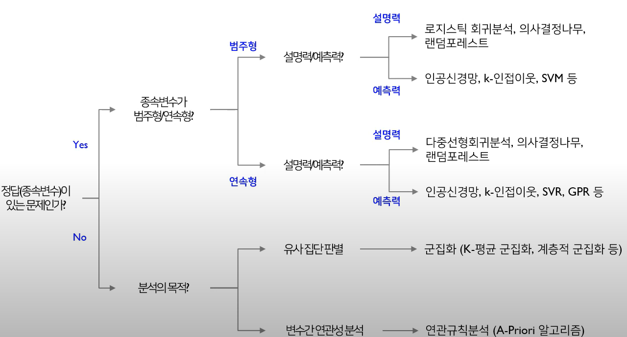 질문의 속성, 데이터의 특징, 결과의 설명력 포함 유무 등을 고려하여 적합한 분석 알고리즘 선택