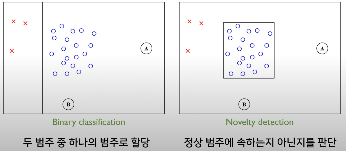 - 이상치 탐지: 목적은 지도학습이나, 방식은 비지도학습을 통해 이뤄지는 문제 유형으로, 대부분이 정상 데이터인 상황에서 매우 낮은 확률로 발생하는 이상치 데이터를 탐지하는 방법론(예: 반도체 공정의 불량 웨이퍼 탐지)