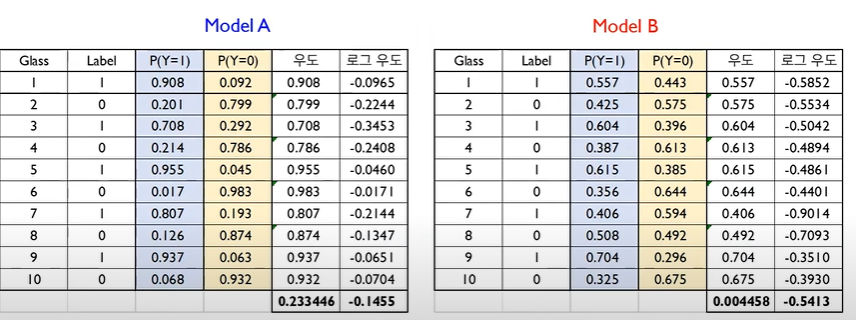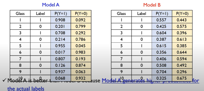 위 표처럼 로지스틱 회귀모델 A, B가 주어질 때, 실제 Label에 맞게 Class에 할당될 확률이 명확하게 나눠지는 A가 더 나은 모델임을 알 수 있다.