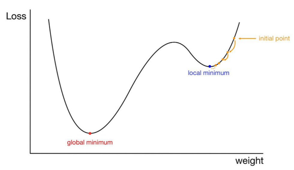 gradient descent 알고리즘에서 초기값이 랜덤하게 설정되기 때문에 어떤 경우에는 local minimum에 빠져서 수렴하는 경우가 발생할 수 있다.
