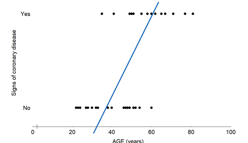 만약 심장병 유무(유(1), 무(0))가 종속변수, 나이가 독립변수인 경우 회귀선을 그리게 되면 다음과 같은 데이터 포인트와 회귀선을 얻을 수 있다.