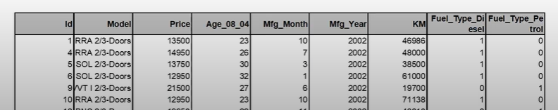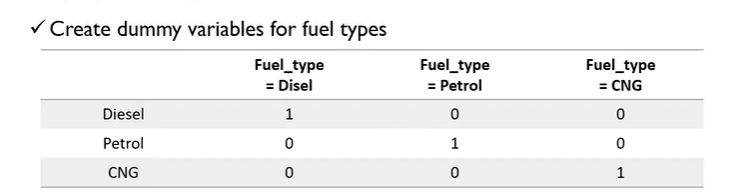 만약 회귀분석에 사용하는 변수가 위와 같이 Disel, Petrol, CNG로 나눠지는 범주형 변수라면 알맞게 전처리를 해줘야합니다. 하지만 위와 같이 한다면 CNG = 1-Disel-Petrol 이라는 식으로 계산되어 다중공선성이 발생할 수 있습니다. 따라서 Disel과 Petrol 여부 등 변수 두 개만 독립변수로 사용해야합니다. 예시는 다음과 같습니다.