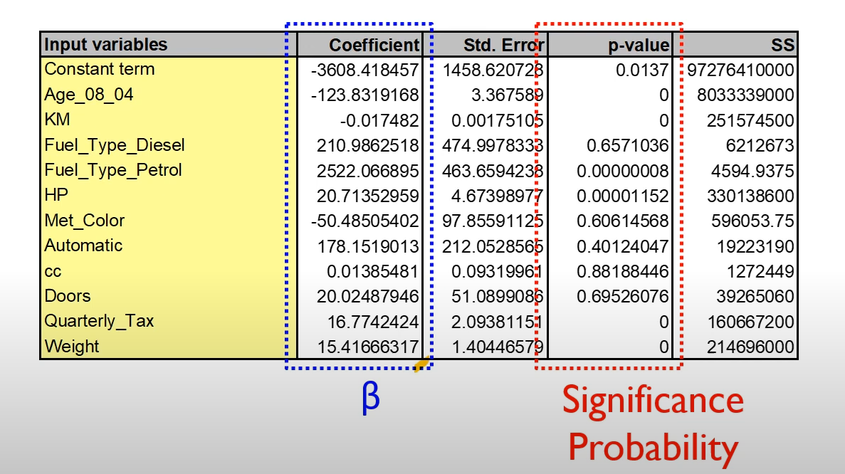또한 는 독립변수가 1 증가할 때, 종속변수의 증가량을 의미합니다. 이때, p-Value가 유의미하다(일반적으로 0.05이하)면 값이 의미가 있어집니다.