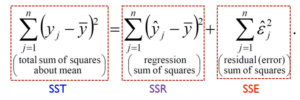 SST는 실제 y값과 y값 평균의 차이로 총변동을 의미하고, SSR은 설명가능한 수치로 y값의 평균과 y 예측값의 차이를 의미합니다. 마지막으로 SSE는 설명 불가능한 수치로 실제 y값과 y값의 예측치를 의미합니다.