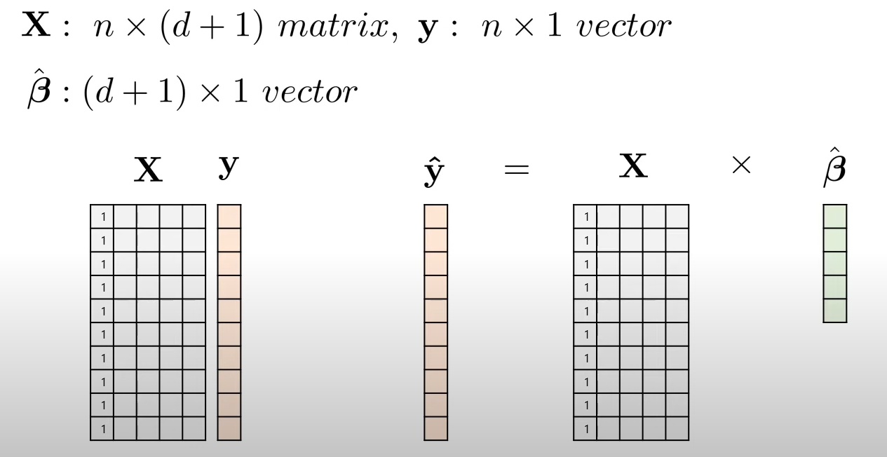 이때 의 첫번째 열은 모두 1로 구성되어 있는 것을 확인할 수 있는데, 이는 은 를 곱하지 않는 상수항이기 때문에 1로 표현해주는 것입니다.