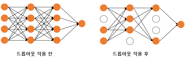 예를 들면 드롭아웃의 비율을 0.5로 한다면 학습 과정마다 랜덤의 절반 뉴런만을 사용하기 때문에 상세한 Train data들을 학습하지 않게 함으로써 과적합을 방지하는 효과가 있습니다.