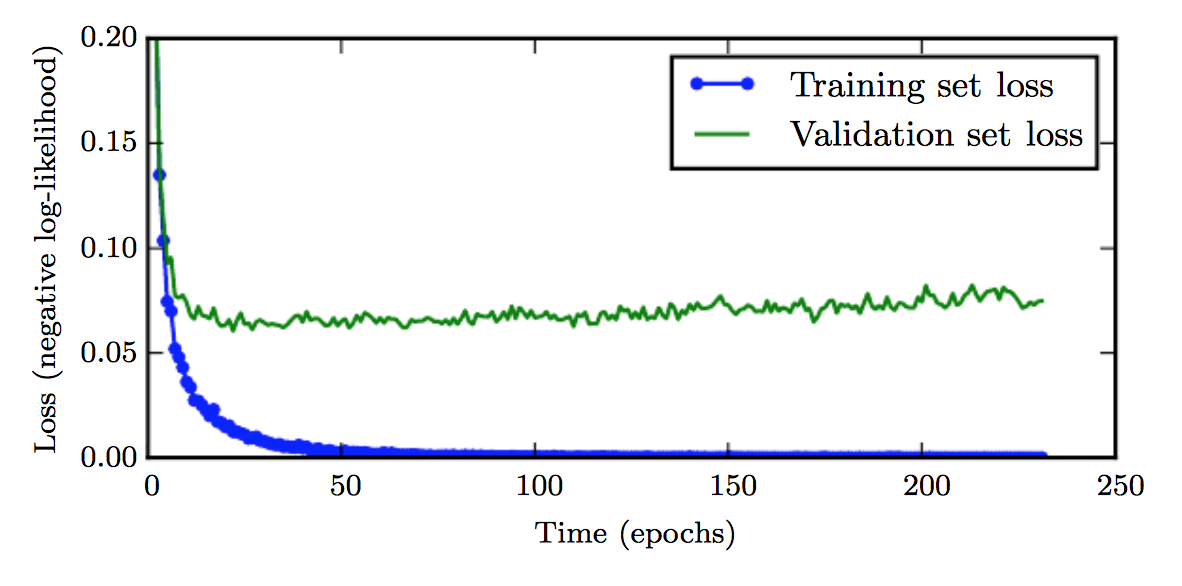 Epoch 수(학습 반복 횟수)가 늘어날수록 학습셋에 대한 오차는 줄어들지만, 검증셋의 오차가 증가하며 과적합이 발생할 수 있습니다.