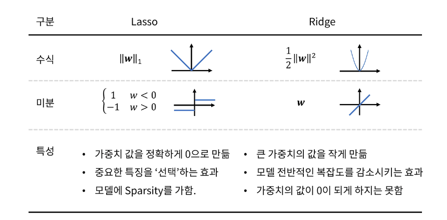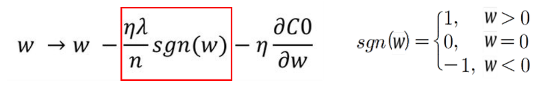 위 식을 통해 Weight의 크기에 상관없이 부호에 따라 일정한 상수 값을 빼거나 더해주게 됩니다. 따라서 특정 Weight를 0으로 만들어주는 feature selection 효과를 가지게 됩니다. 이를 통해 특정 가중치를 삭제해 모델의 복잡도를 낮출 수 있습니다.