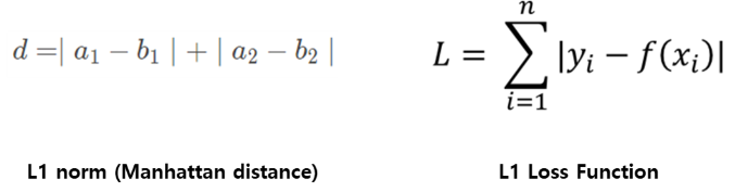 L1 Norm(Manhattan distance, 맨해튼 거리)는 다음과 같이 택시가 블록 사이사이를 이동하는 것과 같은 거리를 의미합니다.