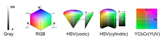 HSV 모델은 우리가 색을 가장 직관적으로 표현할 수 있는 모델이고, 머릿속에서 상상하는 색을 가장 쉽게 만들어낼 수 있는 모델이다. 영상처리 / 이미지 처리에서 HSV 모델을 사용할 때, H, S, V 각각은 0~255 사이의 값으로 표현된다. H 값은 색의 종류를 나타내기에 크기가 의미가 없이 단순 인덱스를 나타내는 것이며, S 값은 0이면 무채색(gray색), 255면 가장 선명한(순수한) 색임을 나타낸다. V 값은 작을수록 어둡고, 클수록 밝은 색임을 나타낸다. HSV 색상 모델은 그림과 같이 원뿔(conic) 형태, 원기둥(cylindric) 형태가 있다.