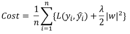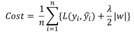 따라서, 이 방법은 Cost 항에 규제항을 더하는 방법입니다. 이때 이 규제항은 모델에서 사용되는 가중치 가 포함되어 있습니다.