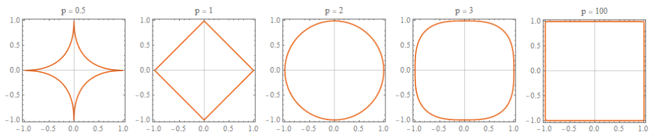 위 그림을 살펴보면 L1의 분포는 마름모꼴, L2는 원, P가 커질수록 정사각형의 모습을 가지는 것을 알 수 있습니다.