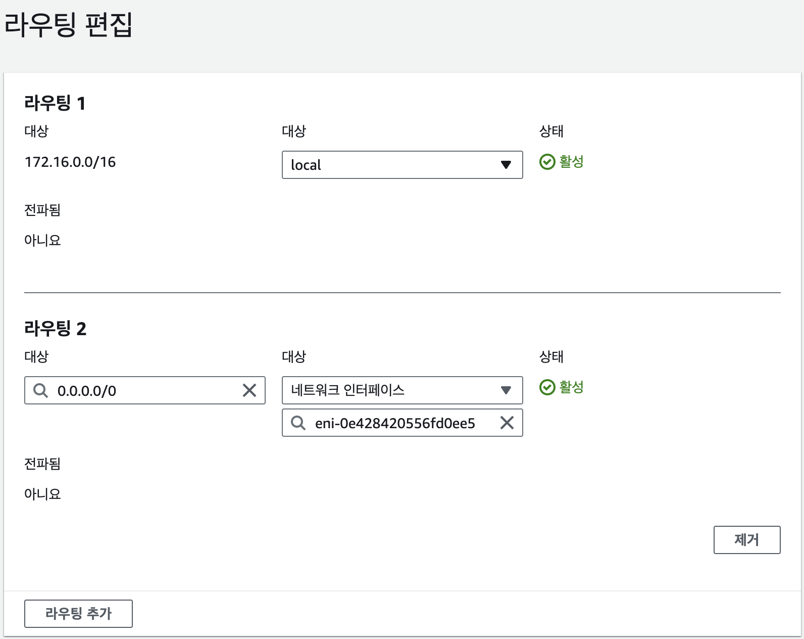 인터페이스가 제대로 설정이 되었다면 라우팅의 대상이 eni-로 된다.