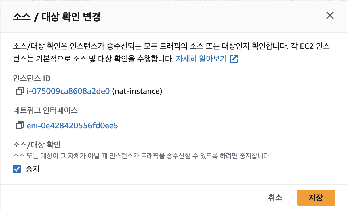 NAT-Instance 선택 -> 작업 -> 네트워킹 -> 소스/대상 확인 변경 -> 소스/대상 확인 중지 선택